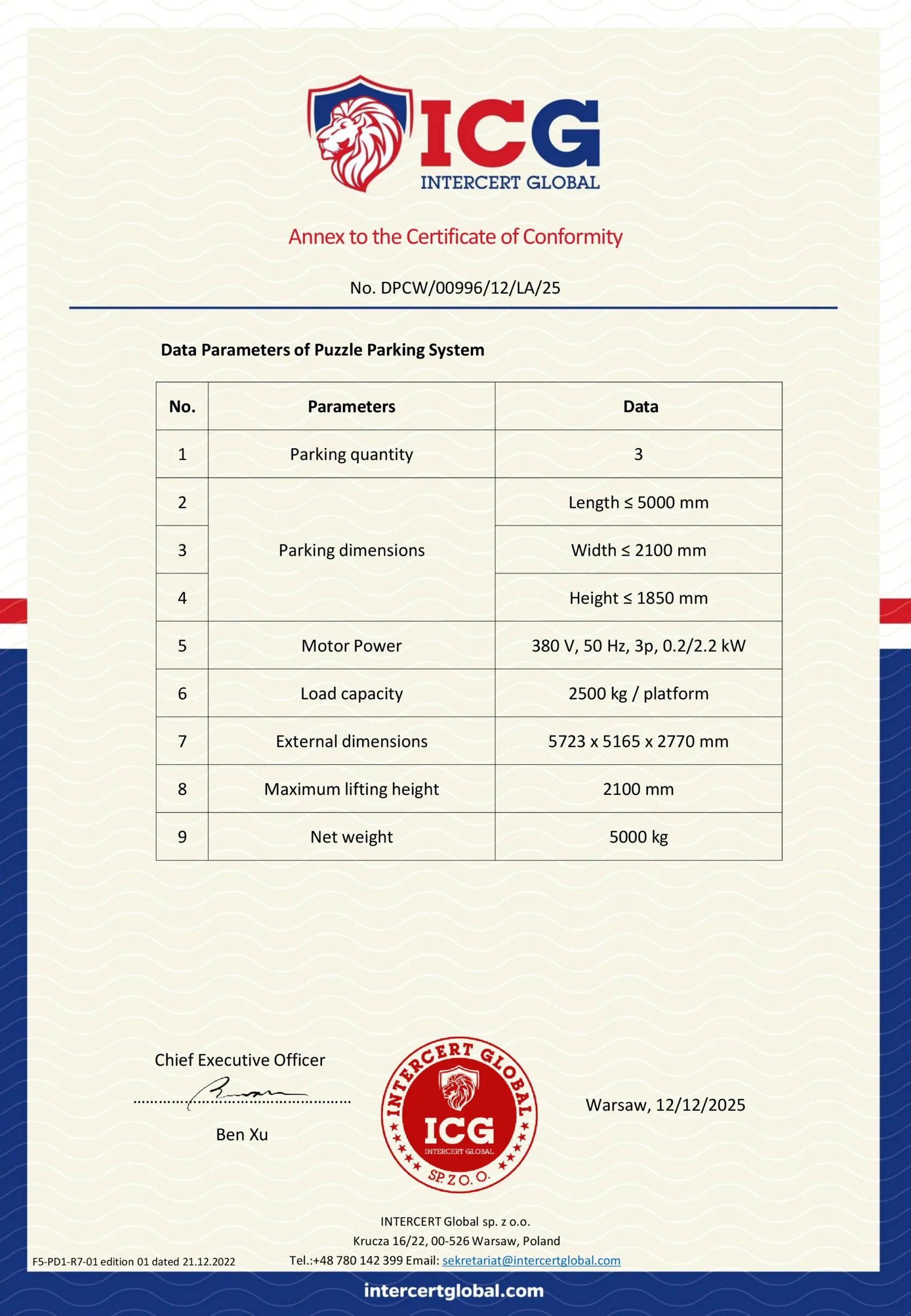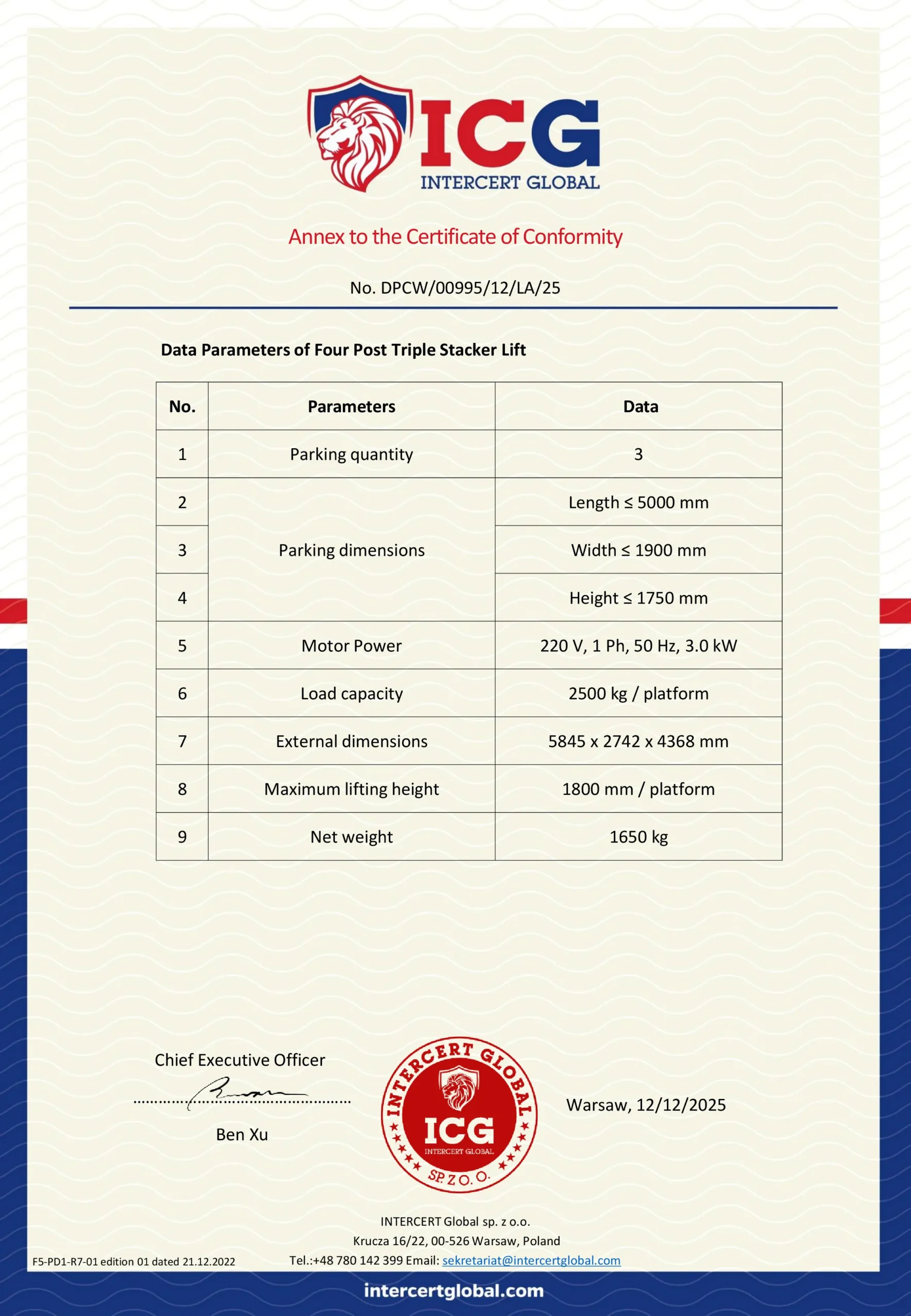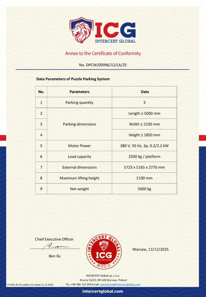 We hold complete certificates and technical annexes for two-post, four-post, and triple stacker parking systems. Every product is verified by third-party authorities to ensure safety, compliance and stability. Our certified equipment is widely accepted in Europe, America and global markets, providing customers with reliable and high-quality parking lift solutions.